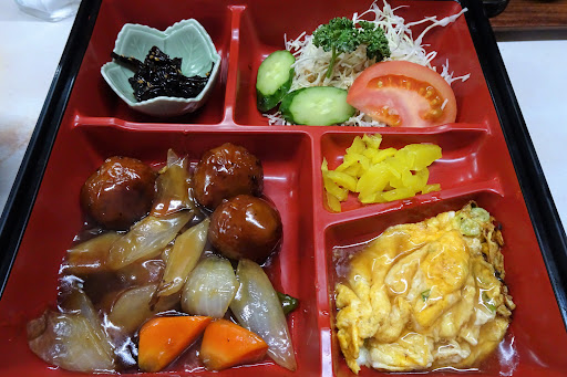 Aランチの内容は 甘酢肉団子、エビ天、玉子焼き、漬物、チャーシュー、ご飯、スープ