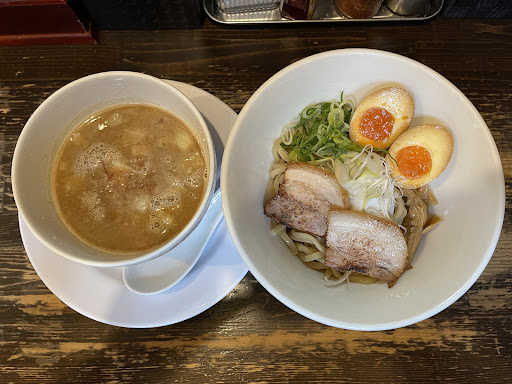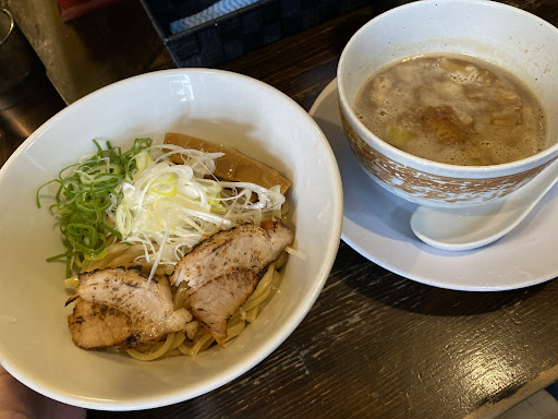 いつもは濃厚ブラックを注文するのですがノーマルのつけ麺を注文。 スープも薄すぎず飲めるくらいの丁度いい塩梅に、チャーシューも焦げ目が香ばしく、特に太いメンマに味がしっかり付いておりこれをおつまみにお酒を飲みたいなと思うほど。 硬麺派の私ですが麺も自家製なのかスープにベストな柔らかさの麺でした。