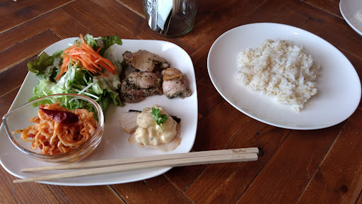 前回行った時には時間が合わなかったのかお休みのようでしたが、今回はOPENの11時目掛けて行ったのでソファの4人がけの席に座れました。 席数は他にはテーブルが3~4つ程、他にカウンター席がありましたが、割と直ぐに満席に。 ランチはメニューが、4種程あり、他にドリンクが付きます。 今回は3種のDELIのプレートにしました。 雑穀ごはんが別のプレートできて、割と内容量もちょうど良いくらいです。 サラダに少し酸味が強めのドレッシングがかかり、食欲をそそります。 鶏肉のグリルかな?結構好みの味でした。 ガラスの器にはオレンジ色の物体上に唐辛子が乗っていますので、一見するとナポリタン風を感じますが、いざ食べてみると切り干し大根!今まで切り干し大根は和風な味付けしかしていなかったのでちょっと面白かったです。 あと、お魚は鯖でしょうか?食べやすく下処理がされていたのでどれも美味しくいただきました。 デザートで頼んだタルトも美味しく、個人的にデザート込みでちょうどお腹1杯という感じでした。