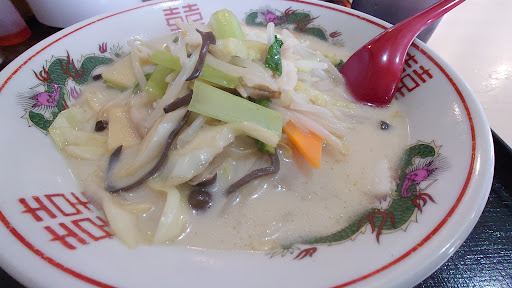 今日は私はちゃんぽん、妻は日替わり担々麺定食(黒)をオーダー、ちゃんぽんは本場長崎のような赤、緑、茶色のの天ぷら(かまぼこ)が入っていないので寂しいのですが、エビが3尾入っていて美味しく頂きました。