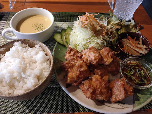 【追記】再訪問です。今度はランチにお邪魔しました。おっさん一人です。お店の扉を開くと同時に「しまった!」感が・・・店内は女性とカップルのみ。まぁ仕方ないので気を取り直し目当ての唐揚げ定食を注文。おかずは1プレートに凝縮され、サラダ、小鉢、唐揚げ(+しそ入りおろしポン酢←これおいしい)が鎮座しています。ご飯とコーンスープがついて800円。コスパ良ですね。女性用に唐揚げ少量バージョン(ケーキ、コーヒー付き)もあります(980円)。量は結構ありカラッと揚がった唐揚げ7個。ご飯の量十分でおなかは大満足です。13時を過ぎると日替わりメニューを注文できるようですので遅くいくのもありかも。この日の日替わり...