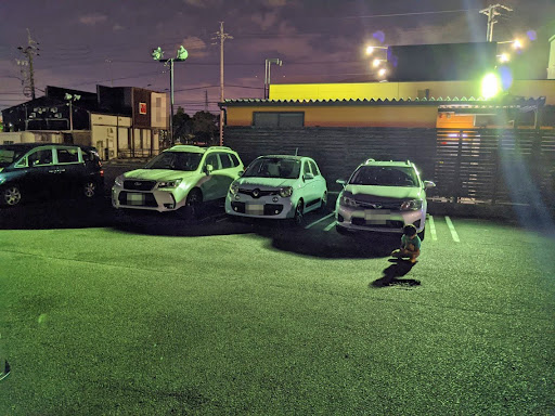 到着すると、若者がたむろってますな。最近の若者は夜こーゆー店に集まるのか? 手前の駐車場は埋まっていたので、店舗裏に向かいます。娘のトゥインゴなんでラクラクですな。結構広いですな。明るめの照明のお陰で安心です。