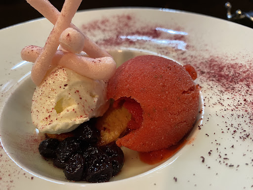●デザート 桃のコンポートとシャーベット レアチーズ添え