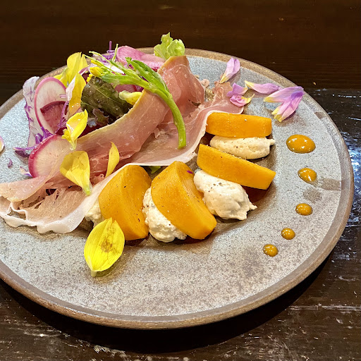 ↓友達と前菜シェア ★柿と生ハムとゴルゴンゾーラ 柿とゴルゴンゾーラの組み合わせが初めてで印象的。 フワフワなゴルゴンゾーラクリームは食べやすく、甘くて美味しい柿とぴったりでした!
