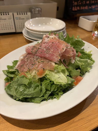 ☑︎生ハムサラダ✨ 原木からの切り出し生ハムがたっぷりと乗ったサラダ ディナータイムに来たらまずはこちらを食べて欲しい