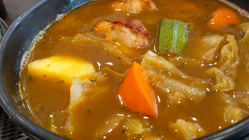 5分ほどで提供。やっぱ早いねw お盆に乗って登場。 https://youtu.be/N2w5UwASigY 香りが良いな。テーブルにスプーンは備え付きのが在るのにーって思ったらフォークだったww ゴロゴロと入ったチキンに野菜類。存在感があっていいね。最初はライスをスプーンで掬ってスープに浸して食べてたけど、途中でめんどくせーと中に入れちゃったww これフツーに皿に盛ってくれって頼んだらやってくれんのかね(・ε・`)