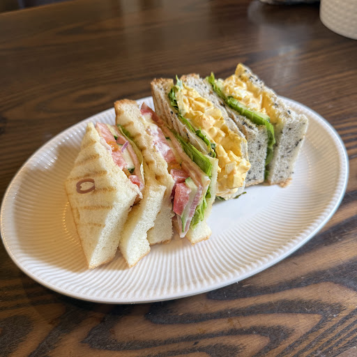 サンドイッチは、それぞれメニューによって食パンの種類が変えてあります!ほんのり甘めのプレーン食パン・全粒粉・黒胡麻。 スモークサーモンのサンドイッチが珍しく、おすすめ!中にはタラモ(明太ポテト)がたっぷりでサーモンの塩味によく合います。ペロリと食べてしまいました。 チーズ&もち豚ロースハム、キュウリやトマト等たくさんの野菜、焼き目を付けたホットサンド。 パンと具材がそれぞれのメニューに合うように作られた、見た目・味の変化が楽しめる、手の込んだサンドイッチに大満足◎ そして、 サンドに刺さっているピックが可愛い干支。自分の干支が来るかなとワクワクしました♪ バスクチーズケーキも濃厚なめらかで酸味が無く、甘くて美味しかったです!