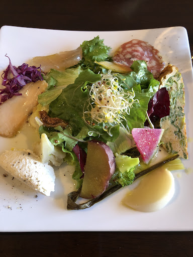 「前菜」って言うかサラダの盛り合わせの美味なこと!!控えめなドレッシングなれどええ仕事してまんニャワq(^-^q)「クルミの自家製パン」の香ばしいさ・最後に供されたデザート「黒ゴマのアイス&焙じ茶のムース&チョコブラウニー」はさすが手前味噌!!嫌みのない味わいなり(^。^)