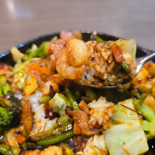 鉄板海鮮チャーハン 1100円 エビ、イカ、タコ等の海鮮と、じゃがいも、ブロッコリー、ニンニクの茎、キャベツ、人参、ピーマン等のお野菜とキムチが入って、甘辛中華風な味の鉄板チャーハンで美味しかったです。