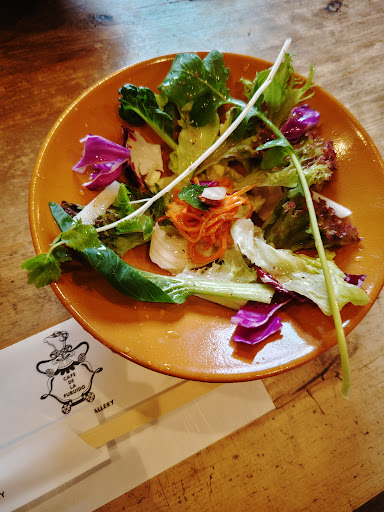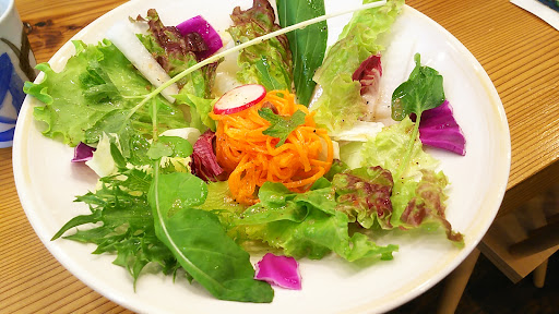 最初に大きなお皿に葉物野菜が 何種も盛り付けられた彩り鮮やかな サラダが出てきました(´︶`)ฅ どれもシャキシャキで新鮮で ドレッシングがとても美味しかった♡