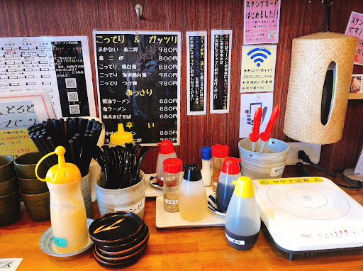 背脂、にんにく、カラメなどもセルフトッピング出来ます。 最初スープがあっさりに感じて、背脂、カラメ入れちゃいましたが、やっぱ麺と具材が少なくなってくるとかなりスープ濃いめに感じるようになりました。 結構な濃い味好きで無い限り、カラメは入れずに具材少なくなるまで食べる事をおススメします。 なんだかんだ初期状態がベストバランスなのかな?と。