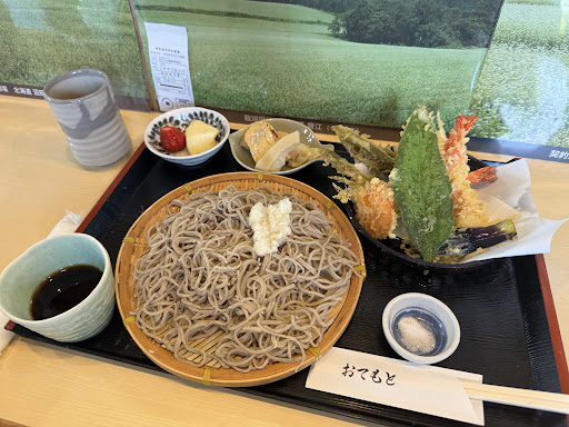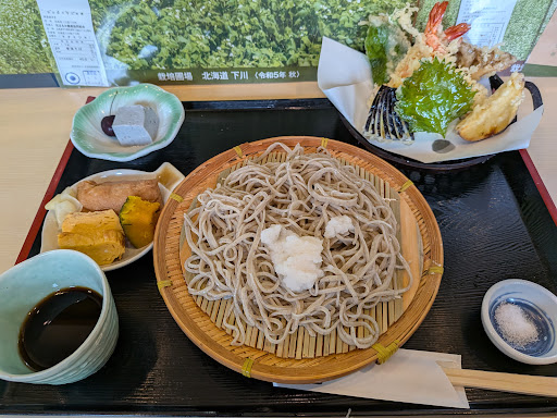 駐車場がわからなかったので、電話をして来訪。 店舗前2台、別で店に向かって左に50メートルほど進むと、右側に看板が建っている5台ほどの駐車場がありました。 色々メニューがあり、こだわっている雰囲気が出ています。 そばが目当てでしたので、天ざるそばをいただきました。 たけのこの煮物やお稲荷さん、卵焼きなども付いていて、お得感があります。 天ぷらの盛り合わせも種が多く、柿の葉やコンフリーなど珍しいものも食べられます。エビ2本はお得ですね。 蕎麦粉もこだわっているようで、カウンターに農家さんの写真などが展示されています。 つゆの味も甘すぎず、塩っぽすぎず、そば欲を充せてくれて、大満足でした。 場所柄や他要素があるのかもしれませんが、コスパが高すぎます。 店主と奥様も優しい雰囲気で気をかけてくれて、一見に...