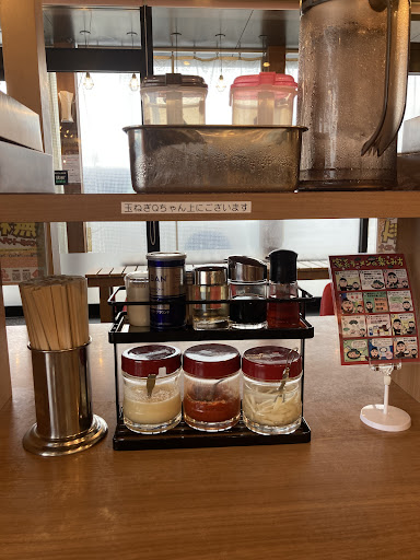 席には調味料などが置かれていて、味変用のニンニクや豆板醤、刻み生姜等色々と味変出来そうです。昼時少し外れていますが、店内には半分席が埋まるくらいのお客様が入っていて、この辺りでの人気ぶりが見えます。
