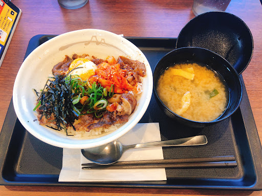 【旨辛牛焼ビビン丼】 温泉たまごがあるおかげでとろみができ、 だいぶマイルドな味わいになります。 キムチは入ってますけど辛さはそこまで。 牛肉の味付けもそこまで濃いわけではないけど、 逆にそれが全体にまとまりを持たせてる印象。 ただ刻み海苔やネギが入ってるだけで、 もやしの食感が楽しめるナムルの姿がない。 ビビンバ風といった方が正しいでしょう、 食感の面ではもの寂しいです。 味は全然いいんですけどね。