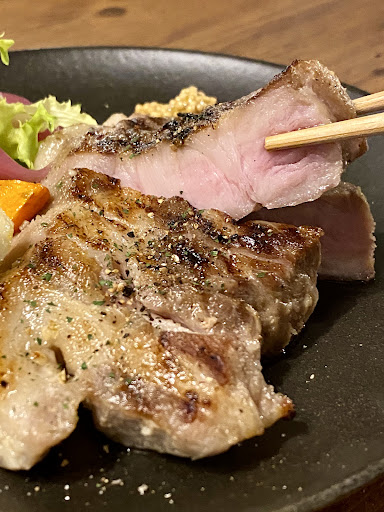 6/30…今回の日曜日も、やつぱり 雨降り。 ディナータイムは18:00〜故、(日没が遅い時季とは云へ)帰る頃には 真っ暗 しかも 雨模様。 運転のしにくさ故、延び延びにしていた再来。 たまりかねて、ランチタイムに 雨天決行。 本来、11:00前後 到着 と踏んでいたが、甚目寺からの途中、" モゾ渋滞 " に依り?、目算が狂う。 一旦 帰宅後、14:00のL.O.前に 滑り込みセーフ。 (失礼ながら)客が まばらなディナータイムとは打って変わり、かなりの客入りで空席待ち。 本日限定の、豚のTボーンステーキ ニンニク醤油ソース が有り、(明日の臭いを鑑みて)一瞬逡巡したが、「ええい、ままよ!」と、欲望の おもむくままにセレクト。 ライスORパン等は売り切れ と聞いた上で、敢えてオーダー、結果的には、ドルチェの受け入れ態勢(体勢?体制?)の余地も、少し残す。 尚 駐車場は、此の店を含むテナント入居者及び其れら宛の来客用として、48台分スペース在り(店の南側で 西に入って直ぐ、各店専用スペースの表示は無し)。