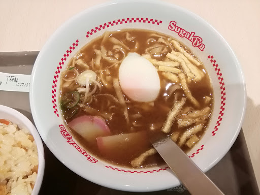 トッピングはネギは丼の淵の方にパラっとあって、青白混在で薬味の務めは果たしているか。蒲鉾は紅白で、2枚あって薄目ながらも象徴的な存在。油揚げは刻まれてあって、なかなか量があって香りにコクが効いてよいもの。温玉はしっかりトロっとするもので、崩せばまろやかに黄身が響くもの。