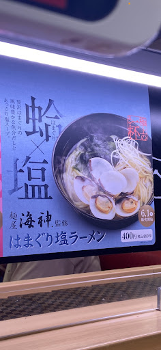 そしてレーンに麺屋「海神.」監修の「はまぐりラーメン」の写真があり、それを見て食欲をそそる写真でしたので、注文しました。 注文をして数分後ラーメンがレーンで到着し、容器の蓋を開けたら、あれ?こんなの頼んだかな?と。 間違えて送ってきた?と、初見で思ってしまうほど、写真とは似て非なるもの状態でした。 蓋を開けた時、ネギのツンとした匂いと、塩とわかめの匂いを感じ、 はまぐりどこいった?と思うのと。 ネギの下に小さなはまぐりが3個隠れている状態です。 極上の一杯と、写真の右上に書かれていますが、普通の塩ラーメンでしたね。 写真で感じたそそる印象はまるで無く、美味しさもほとんど無かったです。