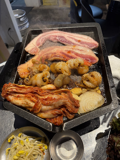 余分な脂が落ちるように設計された独特なフォルムのサムギョプサルプレートで、店員さんが目の前で調理してくれるので安心( ^ω^ ) サンチュにたっぷりの薬味と巻いていただきます。 豚バラの甘みのある脂と、チュクミ(イイダコ)の旨味&食感が美味しかった(^^)