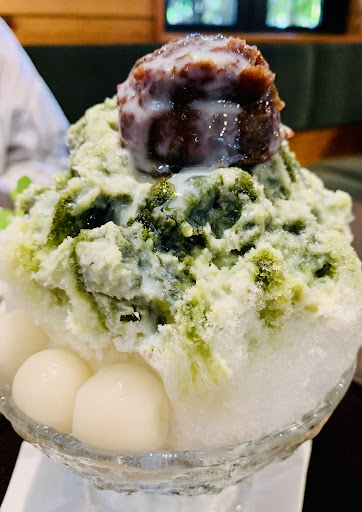 暫くして出てきたかき氷は抹茶と練乳ののシロップが掛かって、頂点にはあんこ玉ww 白玉も添えられて、なかなか凝った仕上がり