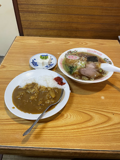 カレーセットを食しました。 半カレー+ラーメンのセットで冷奴がついて税込880円です。 ラーメンの具材はチャーシュー、メンマ、ナルト、小松菜、ネギ、海苔などです。 チャーシューは弾力があり噛み締めるほどに味わいがあります。 メンマはコリコリとして小松菜のシャキシャキとした食感も良いです。 麺は中華麺であり、ふんわりと軽い食感です。 スープはあっさりとして昔ながらの中華そばの味わいでした。 半カレーの具材は豚肉、玉ねぎなどであり、ルーはとろみがあってほのかな甘味とともにピリッとした辛味が来きます。 ライスは柔らかめに炊かれていて、赤い福神漬けが添えられていました。 冷奴には薬味のネギと生姜がのせられており、冷んやりつるりとした食感が良いです。 リーズナ...