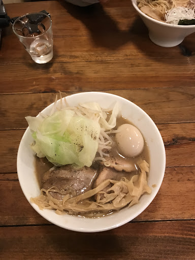 長女が頼んだ " 濃厚醤油そば " は豚ゲンコツと鶏ガラの動物系がガツンと来るパワフルなスープ。 黒胡椒がかかっているので、胡椒の風味あり。 チョッとニンニクの風味も。 キャベツがトッピングされているのは家系を意識してるのかも? 麺は中太麺で、塩系とは変えてある。 濃厚スープには中太麺がベストであろう。