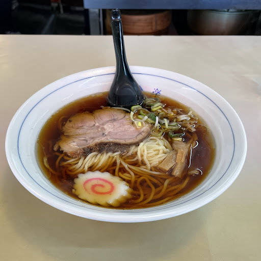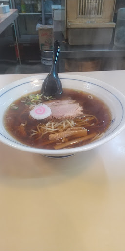 夜に入りました。 街に根差した、昔ながらのラーメン屋と言った趣です。厨房は広めですが、席はカウンターだけで10チョイだと思います。 頼んだのは《ラーメン》600円。《餃子》350円。合計950円です。多分現金のみかと。半炒飯はやっていないとのことです。残念無念。 ビジュアルからして、由緒正しき『中華そば』と称すべきラーメンですね。ナルトが乗っていて、チャーシューとメンマとネギと実にシンプル。ホウレン草かワカメが入っていれば最高でしたが、これぞ日本のラーメンと言った形ですね。 澄んだ醤油ベースのスープは、塩分も程よく出汁の具合も良いです。化学調味料は使っているでしょうが、強くはないかと。コッテリ脂ギトギトが好きな人には物足りないかもしれませんが、アッサリしたラーメンが好きな私には口に合いました。しかし、チャーシューが柔らかいタイプだったので、固い歯応えの有るチャーシューが好きな私には合いませんでした。 餃子はニンニクが効いていて、味は濃すぎない物でなかなかの味。素材の味も残っているので、餃子としてのレベルは高めかと思います。お客さんの多くがビールと餃子を頼んでいました。私としては、もう少しシンプルな味付けだったら良かったです。 当節流行りのラーメンとは違う、昔ながらのラーメンでした。家系等を好む方には物足りないかもしれませんが、アッサリしたラーメンが好きなら合うかもと思います...
