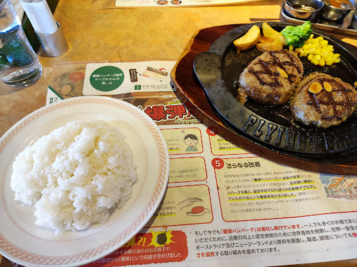 黒ウーロン茶があったり、紅茶を葉から出せたり、ドリンクバーの質はやや高い。 ライスおかわり無料という部分はよいが、店員に頼むのは今の時代正直だるい。 肝心のハンバーグだが、爆弾と名乗る割にはさわやかのげんこつ、ブロンコビリーの俵に比べてボリューム不足感がある。 また2種類のソースを選ぶことなくそのまま使用できるのはよかったが、鉄板がぬるいのかあまりジュージューしないし、岩塩もない(要注文?)ことで体験としての期待値は下回った。