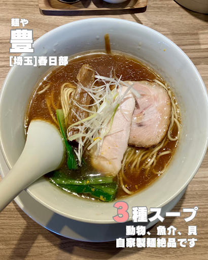 麺や豊 @ 埼玉県春日部市粕壁東1-3-1 どうも、さぴおです ✍️中華そば 950円 (細麺) ______________ 🍥ポイント ✅鶏・豚・魚介のめくるめく出汁世界 ✅鶏のバランス、魚介の押し出し、アフターの貝のジジッとした風味が◎ ✅自家製麺は細麺・手もみ麺を選択可 ✅知名度と美味さが比例してない良店  ̄ ̄ ̄ ̄ ̄ ̄ ̄ ̄ ̄ ̄ ̄ ̄ ̄ ̄ [点数] 87点 ☆4.2 [アクセス] 『春日部駅』(225m) [休日] 火曜日、第三月曜日 [注文メニュー] 中華そば 950円 (細麺) [並び・システム] 訪問時外待ち5人・口頭注文後会計 [食材] 動物出汁、魚介出汁、貝出汁、チャーシュー2種、小松菜、白髪ねぎ、中華麺 [味] 醤油