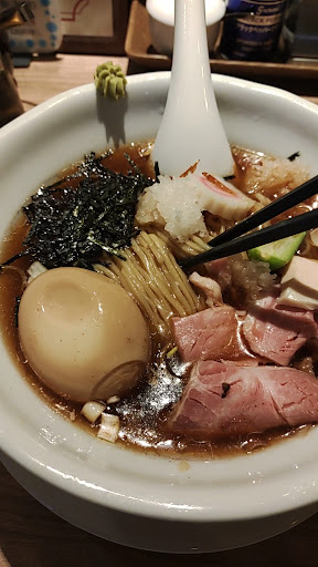 つけ麺の太麺頼みましたが、味はとっても美味しかったです! お肉やも焼いたネギも甘みがあっておいしいし ワサビの味変もさっぱりしててとっても好みでした。お蕎麦の鴨南蛮みたいなつけ汁を想像しておくといいかなと。ただ、なぜつけ麺なのに つけ汁がぬるくてトッピングの具があったかいのかが本当に謎でした。つけ汁が熱々ならもっと美味しいのに。