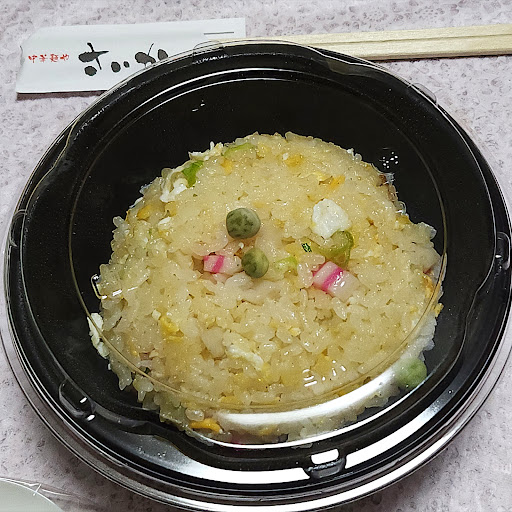 炒飯をテイクアウトしたんですが、量は多くはないです。 具は卵とナルトだけのシンプルな薄味で、ちょっと昔懐かしい感じ。 上に乗ったグリンピースが哀愁漂わせてますw