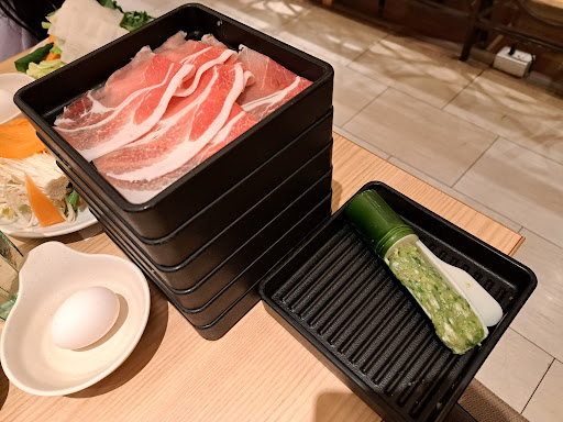 鍋のスープは5種類から2種類選択で、お肉はピンポンを押して店員さんに注文。野菜やご飯、タレなんかは入口正面に取るコーナーがあるのでそこからセルフで持ってくるタイプです。(お寿司も注文書持って行ってお寿司コーナーで頼む模様)
