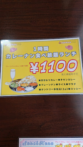 Read moreYouTubeでインドの料理動画を見始めてから、インド料理にドはまりし、インド料理を検索。ごくごく近所にあることを知り、行ってみました。 初めての来店ですが、2歳の息子がカレー苦手な為、大人の分だけテイクアウトでいただきました。 外観や内装は何だか、うどん屋さん?な感じですが、店員さん2人共に優しくて素敵でした。メニューのほとんどを持ち帰りできるそうですが、ドリンクだけは持ち帰れないので、『待ッテル間ニ飲ミマスカ?』と提案してくださり、念願のラッシーをいただきました。すごく美味しかったです!カレーもタンドリーもチーズナンもめちゃくちゃ美味しかった!ボリュームもあるし、辛さも選べるし、味も本当に美味しい!食べ放題もやってるそうなので、今度はぜひ店内でいただきたい...