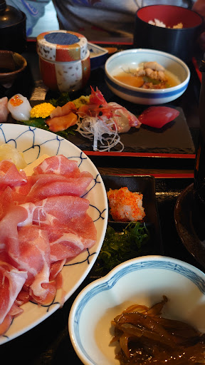 偶然見つけたお店で割烹の看板でしたが20時40分で回りに他店なく入店。値段がリーズナブルなので期待せず。期待を裏切られました。定食多数あり。2種類の定食を注文栗豚肉しゃぶしゃぶと加東定食を注文。ビックリ栗豚肉の量多い。山形県の豚肉で美味しい。鍋用の野菜もたっぷり。加東定食は鍋焼きうどんに別のせ天ぷら・ご飯・小鉢三種でうどんは三草茶うどんともち麦のどちらか選べます。もち麦うどんモチモチで美味しい。何よりも白飯は最高に旨い4人共絶賛地元のお米で美味しい地区で作られたお米を使われていると聞きました。お店のご主人はとってもいい方でラストま際に入店したのに嫌な顔せずに親切に対応してくれ貰えました。他の定食も食べてみたいので行く予定...