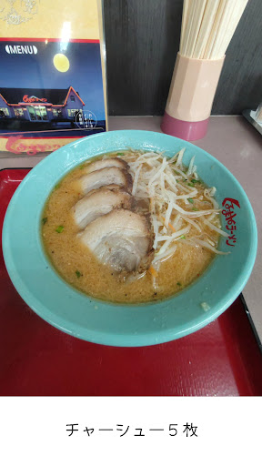 【具】 チャーシュー5枚は厚さは5ミリ程、味はシッカリ入り、噛みごたえがあるタイプで上質 ・モヤシ、ニラ