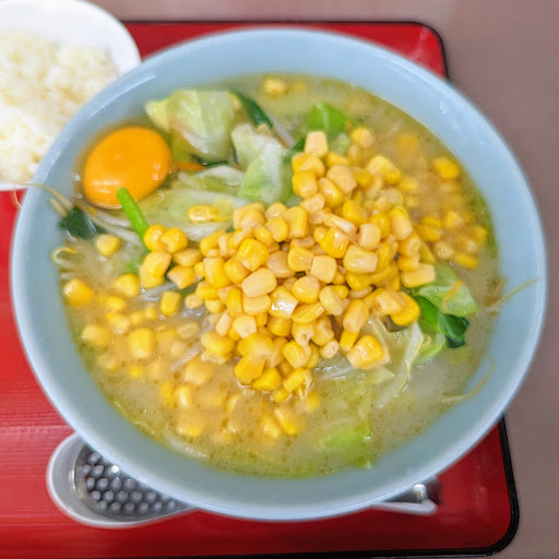 Read more香取市小見川のくるまやラーメンさんに行ってきました🐖 店舗前の駐車スペースに車をとめて店内へ🚶♂️ カウンター席に座りメニューをチェック👀 この日は健康志向でしたので野菜ラーメンにトッピングでコーン&生たまごを注文。 サービスの半ライスもお願いしました🙏