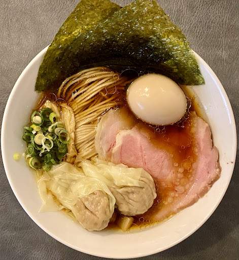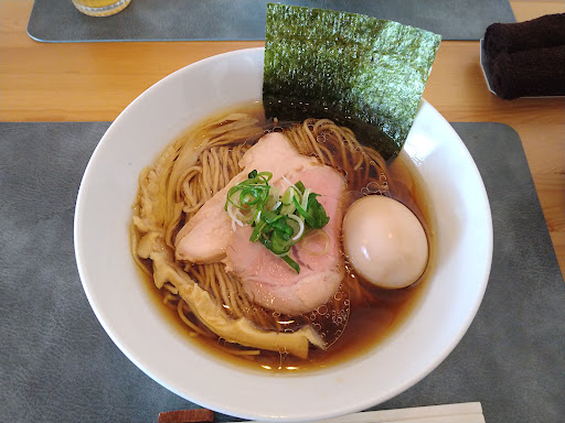 Read more銚子方面に出向いたので帰り道、香取エリアで気になっていたこちらのお店へ立ち寄ってみました お店は国道356線(利根水郷ライン)から一本裏通りの立地 現着は12時チョイ前。駐車場は満車?と思いきや1台分だけ空いてたので滑り込みセーフ! 専用駐車場は店舗前に5台、道を挟んだ反対側にも5台停められます。店舗前の駐車スペースは、夜間は10台分停められみたいですが 昼間は隣接する『寿司処 纏』さんの専用駐車スペースがあるので要注意(外観写真参照) お店の入口付近には、数名がウェイティング中。店内に入ると入口に番号入りの黒い携帯呼び出しブザーが並んで置かれています 混雑時は入口にあるウェイティングシートに人数と携帯ブザーの番号、車のナンバーを書き込み、順番が来るとブザーで呼び出してくれるシステム ☀️夏場の暑い中、小さな子供連れやお年寄りが一緒でも車の中で待機できるのが有難い さて、店先の長椅子で待つことしばし。。 携帯ブザーが鳴り店内へ 携帯ブザーを充電器に戻し、券売機で食券を購入 女性スタッフの方から空いてるカウンター席へと案内されます 店内は和モダンな造りで落ち着いた雰囲気。席には予め濃グレーのランチマットが敷かれており、箸とレンゲがスタンバイされてます。驚いたのはハンドファン扇風機が各席に一個づつ置かれており、ゲストに対して粋な計らいが感じられました☺️ 広々したオープンキッチンには、イタリアン畑出身 ワインソムリエの資格を待つ若き店主殿と男性スタッフの2名、女性スタッフの方がホールを担当。皆さん丁寧な接客で好印象 食券を渡す時、味変用に生姜(無料)も一緒にお願いしました 待つことしばし、特製醤油らぁ麺の登場です♪ おう!見た目から美味そうオーラビンビンのビジュアル😋 鶏油玉煌めく澄んだスープは、大山どりの丸鶏とガラ、鴨ガラをじっくり炊き出し 濃密な旨みを掛け合わせた淡麗系。地元「ちば醤油」をベースに数種類の醤油をブレンドしたカエシにふくよかな鶏鴨出汁の旨みがクロスオーバー。後を引く滋味深い上品なスープです 具材は海苔2枚、低温調理されレアで柔らかな肩ロースチャーシュー2枚、肉雲呑が2個、メンマ、九条ネギ。味玉は地元香取市にある『千葉エッグファーム』の「美味たま」を使用。絶妙な半熟加減で濃厚な味わい 麺は菅野製麺所の謹製。低加水でパツッとした歯触りの細ストレート、全粒粉配合で小麦風味豊かな美味しい麺です 途中、小皿で提供されたおろし生姜をスープに少しづつ足していくと、まったりしたスープに生姜の辛味と爽やかな風味が加わり 後味スッキリ。より一層食欲をそそります ジンジャー好きなら是非お試しあれ! さて、半分程食べ終えたところで...