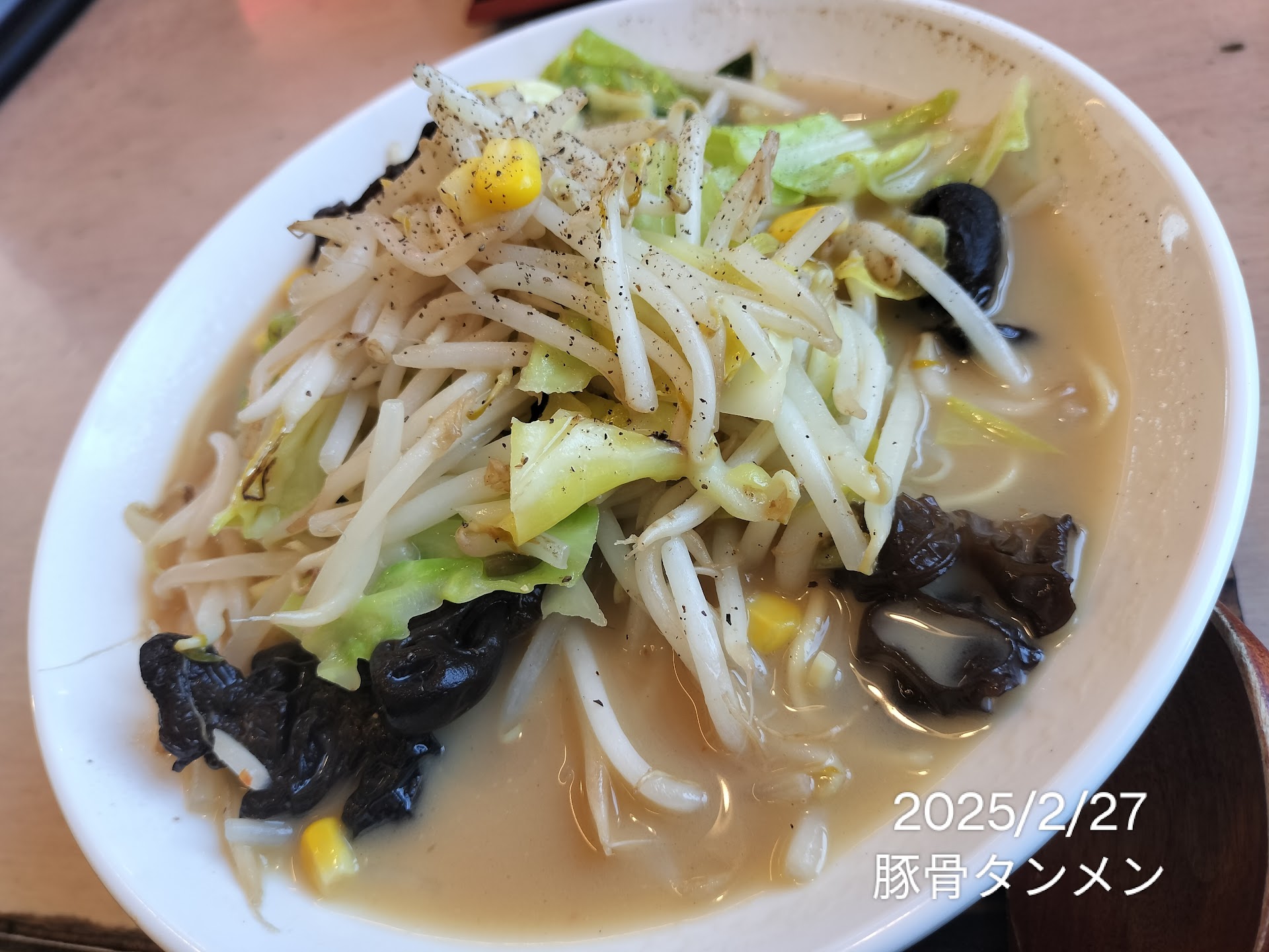 2025/2/27 初入店 豚骨タンメン(期間限定メニュー)を注文 私的感想です、 具材:モヤシ・キャベツ・キクラゲ・コーン・人参・ニラ スープ:豚骨 麺:中太麺 具材は塩コショウで炒めた感じでしたがモヤシは茹でてる感じがして全体的は油ぽく無くさっぱりした野菜炒めな感じでとても親切な野菜炒めに感じました。 豚骨スープも角の無い飲みやすく麺の中太麺も豚骨タンメンに良く合う感じで食べ応えが有り満足感が有りました。 食後の胃もたれも無い自分には丁度いい豚骨タンメンでした。 期間...