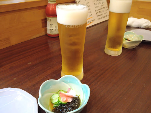 肝心のお食事ですが、地魚のお刺身、とーっても新鮮でした。量の割にちとお値段はりますがカワハギの肝和え、特に美味しかったです。日本酒も進みます。 そのほか魚以外に唐揚げも頼みましたが衣が特長的で、なんの粉を使ってるんでしょうか…?衣がザクザクで、連れはそれが美味しかったようです。味付けは鳥自体には下味はほぼついてなくてチリソースで外から味付けするタイプでした。