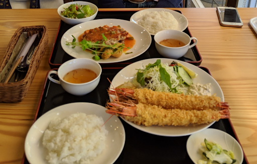 ランチメニューには、サラダ、スープ、ライスが含まれ同時提供くださいます。サラダは新鮮野菜が使用されているせいかヘルシーで、ドレッシングとの相性が抜群でした。ライスはモチモチとした食感で、とても美味しかったのですが、ボリュームは控え目となり、大盛の選択が可能であれば尚良いと個人的には思いました。 メインとなる、舌平目のソテーは柔らかく、熟成ソースとの味わいが絶品です。エビフライには大きな有頭エビが盛り付けられ、かなりのボリュームを感じられました。フライとの相性が良い特製タルタルソースとサクサクに揚げられたエビフライは、このカフェの看板メニューでもあると言えます。 デザートにはスノーアイスを頂きました。かき氷やアイスクリームとは食感が全く異なり、雪解け食感に練乳やチョコクリームが見事に調和していました。同時にスノーアイスは食べられる機会が少ない為、個人的には、とて...