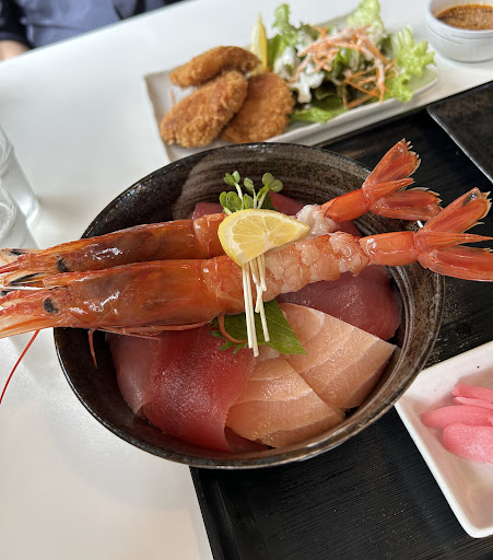 Read moreゴールデンウィーク中に伺いました。流石に混み合っていましたが、車内で待機、順番が回ってきたら電話で呼び出ししてくれるのでありがたかったです。ただ駐車場が5、6台分(うろ覚えですが)くらいしか無いので満車時は断念するしかないかも… 店内はお洒落なカフェのような雰囲気。2階もあり、吹き抜けで小ぶりなお店ながらも開放感がありました。 主人はハーフ海鮮丼大盛り、私は海鮮丼と魚魚メンチを注文しました。 カフェのような雰囲気でリーズナブルだったので、量が少ないのではと心配でしたが、大食いの主人も満足の量でした。 とにかく海老が美味しい!とろけます!海鮮丼には2尾乗っていました。頭もついてるので海老味噌まで堪能できます。 単品で頼んだ魚魚メンチも3つもお皿に乗っていてビックリ。しかも美味しい。お肉かと思うほど味がしっかりとしてジューシーでした。 ハーフ丼と魚魚メンチについてきた勝浦坦々ソースもgood。辛すぎないピリ辛でネギのシャキシャキもアクセント。 久しぶりに美味しいお店を見つけた〜と感動しました。 主人は従業員の話し声がうるさかったと言っておりました。確かに店内が結構静かだったので、従業員の学生バイトの方かな?静かな店内にだいぶ響いておりちょっと残念だったかも;; 私的には無料のお水がとてもカルキ(?)臭かったのが気になりました…土地柄か!?そんなことないか… それらを加味しても食事が良くてまた行きたいと思いました! 改善の...