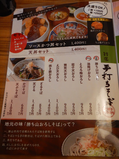ランチ時に利用。 ソースかつ丼おろしそばがセットになった、ソースかつ丼セット(1,400円)のそば大盛(250円増)を注文。 しばらく待つと出てきました。 セットメニューの為か、丼は小ぶり。 それでも麺類とのセットメニューには大抵ついていない味噌汁が付いていました。 その味噌汁も具だくさんでこれは良かったです。 ソースかつ丼そのものも甘めのソースで辛さが足りない方は七味で調節するようで、実際、トレーに載ってました。 そばは繊細さが欠けている感じがしましたが、大根おろしが入った出汁は濃くなく、また大根の辛みが抑えられえていて食べやすい。