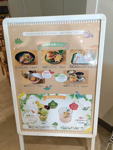 子供用のプレートランチが、950円でドリンク付きなのはとても助かります。 他にも、カフェメニューもあるので食事以外にも使えます。 価格は、この手の施設ではよくある価格帯なのでそこまで高くは無いですが、4人家族で5,000円超えます。 子ども向けにラーメンもあるとより良いかと思います。今後の改訂に期待ですね。 バスターミナル隣にも飲食店はありますが、席数が少ないので博物館に入ったのならこの店を選ぶ他なさそうです。 期間限定メニューや恐竜モチーフのメニューがあるので、恐竜好きなら満...