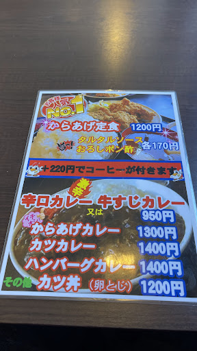 Read more唐揚げカレー1200円食べました。値段は高めと思われますが、大人からしたら、メガ盛りです。唐揚げのクオリティは群を抜いています。朝食を抜いた方は是非オススメ。ご飯は500gくらい体感です。カレーは激辛で辛党の方でも、大満足。唐揚げも食べる方に食べやすいようにカットされており、カレーのルーに絡むぐらいのサイズにカットされてます。駐車場に車を止めますと、カレーのいい匂いがします。外来の方にはいつも、ゆ...