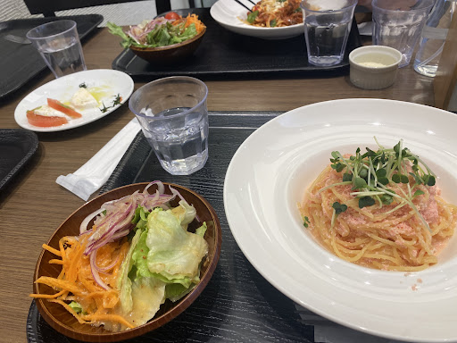 自動券売機で購入し、発券される番号で料理を受け取るセルフ方式でした。サラダバイキングは新鮮な野菜とオリジナルドレッシングが楽しめます。ラザニアはチーズタップでおいしかったです。席は店内とテラス席があり、私たちが行った時間帯(14時頃)はどちらも空いていました。11月下旬でしたがこの日は暖かくテラス席でも寒くなかったです。