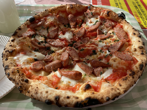 カウンターに取りに行くと紙皿の上に置かれた結構大き目なピザ、 その上にはタップリのチーズと自家製ソーセージが乗っかってます。