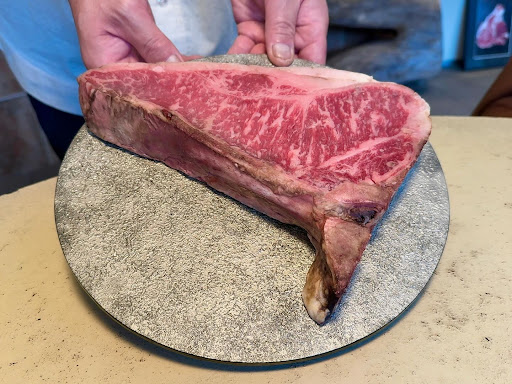 赤城牛サーロイン(2歳の雌の2ヶ月熟成)のビステッカ 山葡萄のソース トレビスとターメリックのペースト