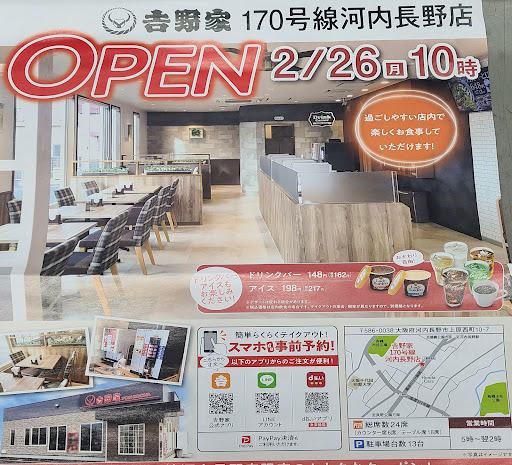 Read more2月26日に改装オープンした吉野家170号線河内長野店に11時45分頃に入店。 入店後カウンターで注文して会計、フードコートの呼び出しベルをもらって、注文した品物が出来たら自分でカウンターに取りに行き、食べ終えたら食器戻し口に戻すという方式に変更になってました。 お水もセルフ、七味や紅ショウガ、お箸、爪楊枝もカウンターに置いてあってセルフです。 有料のドリンクバーも含め、自分で取りに行ったりしないといけないので店内を歩く人が多く、落ち着いて食事が出来ません。 食器戻し口のカウンターも下げたお盆がいっぱいになっていて、オペレーションが回ってなさそうでした。 テイクアウトはタブレットで注文するようになっていて、困っている人が多くおられました。 トイレは女性用個室が1つ、男女共用の個室が1つありました。 注文時にゆっくりメニューを見ながら迷うような雰囲気でもなく、人件費削減のための変更だとは思いますが、前の方が絶...