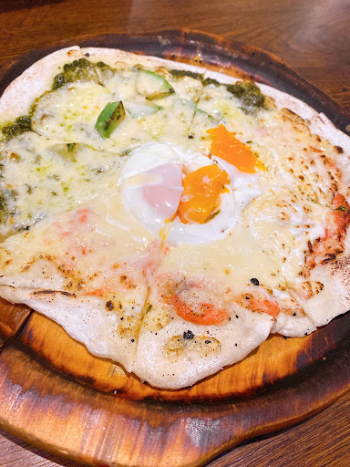 料理はフリーだったのでお目当てのピザかパスタ迷いましたが…飲みながらなんでピザにしました。ピザも人それぞれ好みの生地があると思いますが、クリスピータイプの薄い生地は重たくもなく自分的には正解でした。後半、男性スタッフにお勧めを聞いて頼んだアヒージョも美味しかった。ガーリックバケットを付けるのが断然おすすめです。