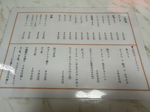 店内は非常に綺麗です。 4人掛けテーブル席が4つ。テレビ有ります。 みそラーメンは炒め野菜たっぷりで食べごたえ十分、スープは少し甘めの味噌のコクあり非常に美味しいです。タンメンも炒めた野菜たっぷりでスープがじんわりと染み渡ります、非常に美味しいです。 男性と女性の二人で切盛り御夫婦でしょうか、とても丁寧な仕事ぶりです。美味しいわけです。 提供まで少々時間がかかる模様です、料理を待つこの空間はどこか懐かしさがあり実家の食卓でオカンが作る料理を待っているかのような雰囲気です。居心地が良くゆっくりとした時間が流れます。 店名通り街中華と洋食屋のメニュー構成、これは通うことになりそうです。