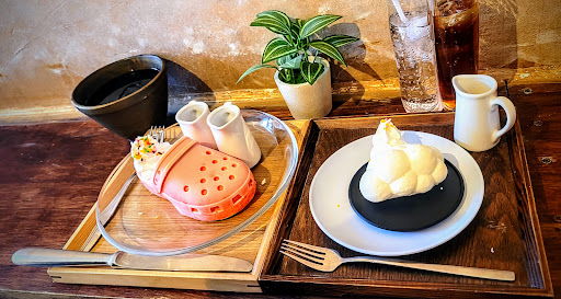 サンダルケーキはサンダル部分がチョコレートで、中に生クリームとスポンジケーキが入っています🩴 ブルーベリーと抹茶のソースが付いていて、かけて食べると味変になります